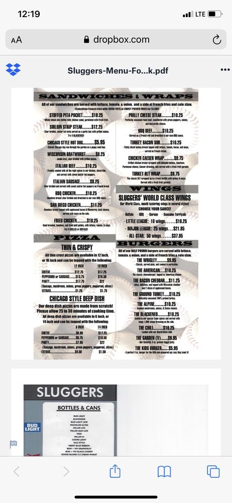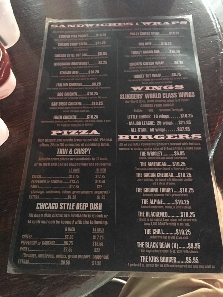 Sluggers World Class Sports Bar Menu
